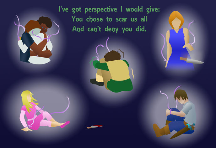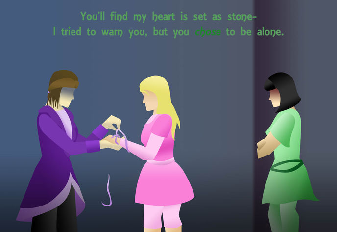 This project is a storyboard using song lyrics I wrote for ideas I've been working with since high school. The focus was to convey the story of Siler (purple) and Cheryl (green), their broken friendship, and what it takes to mend it.